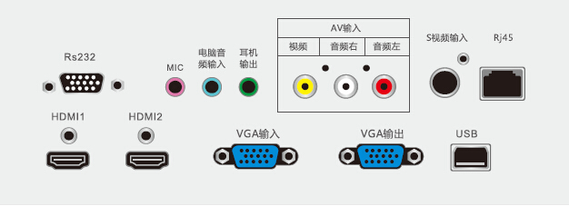 可支持HDMI,USB,VIDEO,S-VIDEO,RS-232,RJ-45,AV口,VGA输入输出,