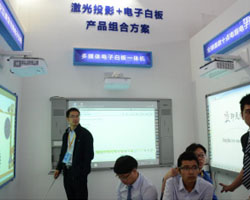 中光学展台上,最引人瞩目的便是中光学COSTAR今年新上市的激光教育投影机,该系列投影机采用激光光源超短焦设计,优质的图像质量,一流的防尘系统。中光学激光投影机已经完全能够满足教育教学的各种投影需求,同时所呈现的明亮、清晰、色彩饱和的画面得到了在场参观者的一致认可。作为中光学COSTAR机器家族中的销量冠军,高清高亮短焦系列投影机不但拥有极致色彩、高亮度的表现,而且同时提供高对比度表现,以确保文字和线条都格外清晰、锐利,并可呈现出更深的黑色和细节。即使在教室最后一排,老师的课件仍然可以被后面的同学轻松阅读。 |
