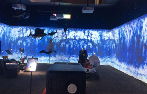 视美乐沉浸式全景融合CAVE空间CAVE空间是一种基于投影的虚拟现实系统,它由围绕观察者的四个投影面组成。四个投影面组成一个立方体结构,其中三个墙面、地面采用正投方式。其特点是分辨率高,沉浸感强,交互性好。整个CAVE空间采用了10台视美乐激光工程机SML—PX550,全方位覆盖所有投影区域,整个立方体的空间仿佛是一卷完整的全景式画轴, 所有景象正在眼前发生,让参观者身临其境。 |