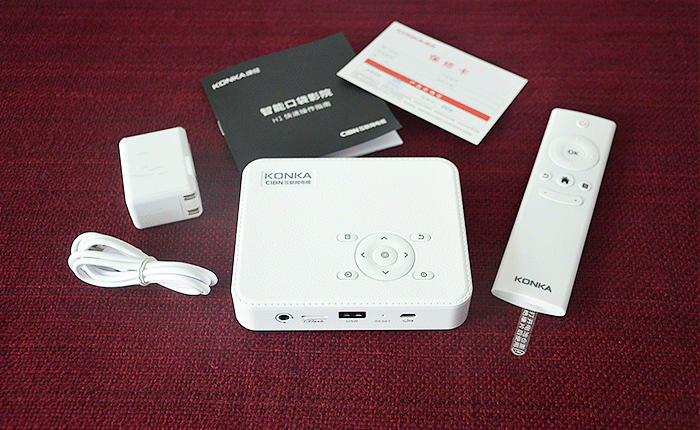 康佳H1不仅外形小巧,配置也极其简单,省去线多杂多的烦恼。在康佳H1 的小小包装盒中,配置了适配器、数据线、红外线遥控器以及说明书(主要的产品规格参数在说明书中都有详细的说明)和保修卡,就是这么简单!