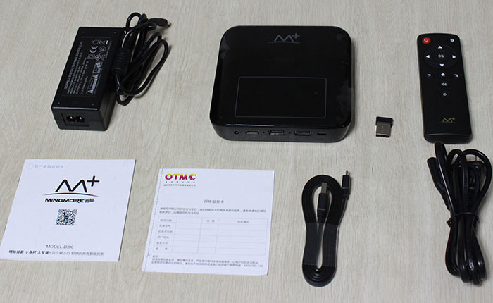 全家福:1×适配器、1×微型投影机、1×无线接收器、1×2.4G遥控器、1×说明书、1×保修卡、1×数据线。