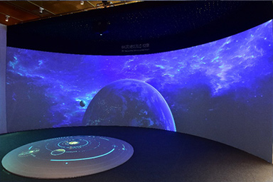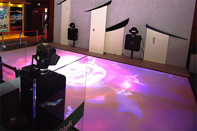 该展项采用了12台索诺克Sonnoc SNP-LU8500投影机配合A15镜头投射一幅360°度及地面的整体画面,并配合相应软件系统,可以让观众站在中间距地面高40公分的圆形玻璃台上,任意观看四周的环形幕布的图像以及地面的图像,让观众仿佛置身于影像中。