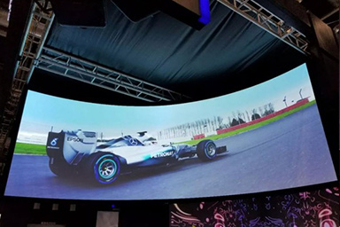 走进爱普生展位, 在一块5.76 x 2m的曲面巨幕前, 激烈的F1大赛,让我们仿佛置身赛事现场。 这全是两台CB-L1755UNL+ ELPU04的功劳, 15,000lm色彩亮度*1,搭配WUXGA分辨率, 带来明亮清晰的视觉感受。 3LCD技术结合激光光源, 呈现精准白色画面,还原靓丽色彩。