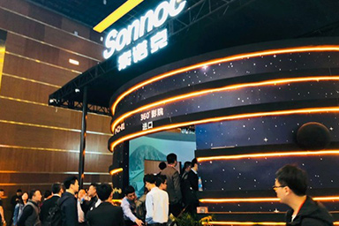 在这个追求“体验感”和“融入感”的时代,全景的观影方式,可以将观影体验升级为虚拟世界遨游。在索诺克展区,360°全景影院的体验无疑是最吸引人流的地方,悬空的圆形玻璃栈道上人无虚席,好不热闹!