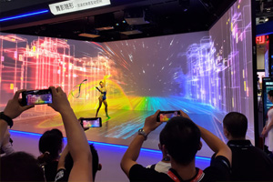 走进中科极光展厅,海底巨鳄迎面而来,似乎要冲出画布。真实震撼的裸眼3D效果,带观众步入神奇的光影世界。视角从海底进入森林,借助智能轨道镜系统,一只猫头鹰从树枝“穿越”到了窗口,时而停留,时而飞翔,在展览空间中270度盘旋,观众视线跟随猫头鹰的轨迹,感受“造梦空间”中的各个展示亮点。随着轨道镜的旋转,地面出现“互动游戏”的文字提示,揭开帘幕进入赛博朋克的律动空间。这是中科极光重点打造的沉浸式交互空间,五台投影仪将三面墙体和地面组合成一个沉浸式的娱乐空间。