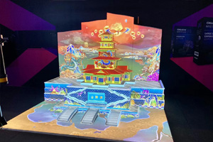创意展区带来的是一场迷人的中国风实景演艺3D投影秀,它在一座长 6 米、高 3 米的仿古塔楼模型上进行。这场投影秀配置了四台专为中国市场研发的 20,600 流明科视Christie DWU2022-HS 1DLP® 激光投影机、科视Christie 潘多拉魔盒以及科视Christie Mystique。该投影演示突显了科视Christie 集成解决方案的优势,是最近在广州和南京的路演中的明星展项。在展会上,该投影秀无论从设备配置和演示内容,都进行了重大升级,让大家耳目一新。